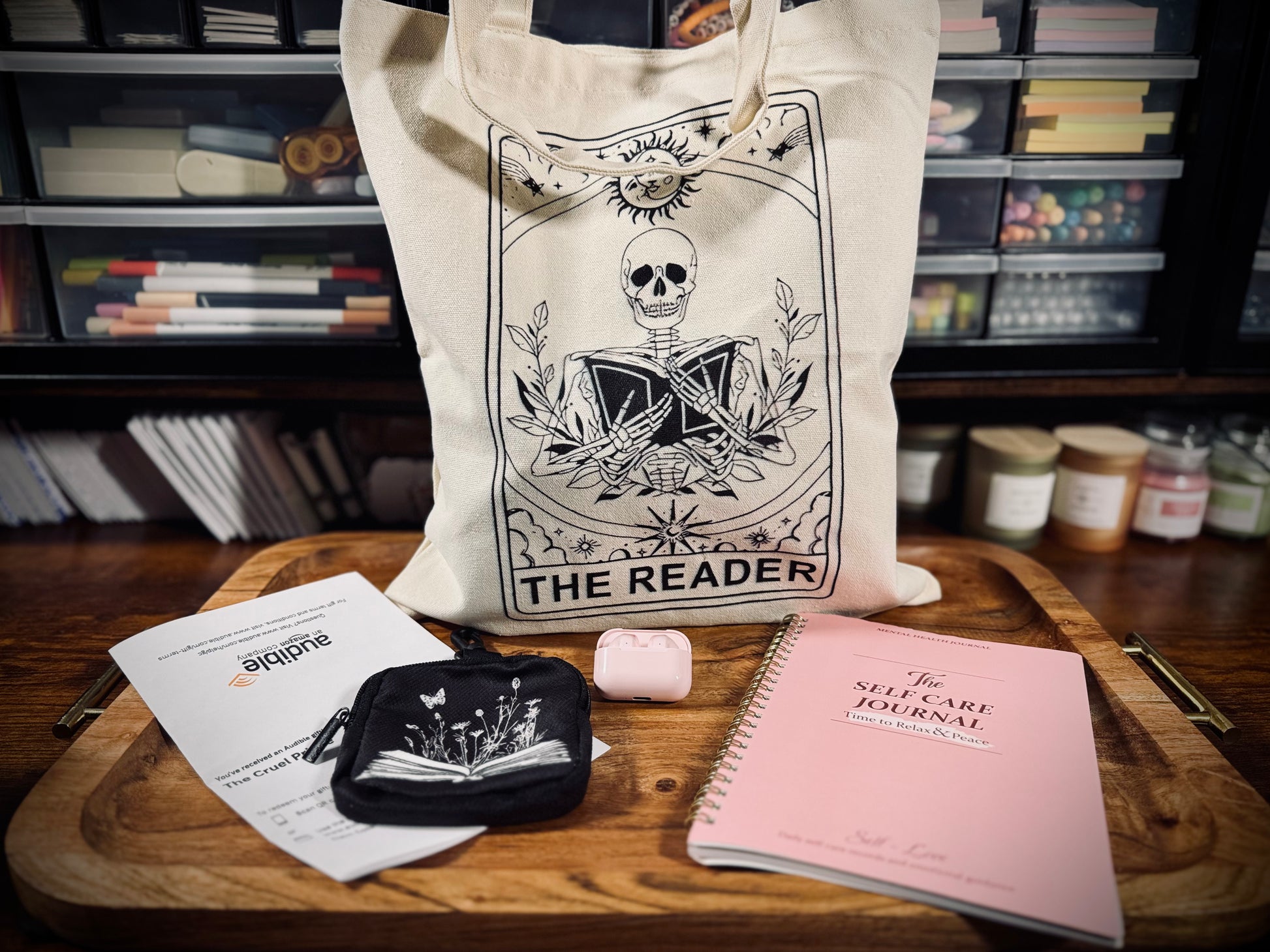 In this bundle you will receive an audio book, tote, self care journal, pen, wireless earbuds, and earbud storage clip on case.